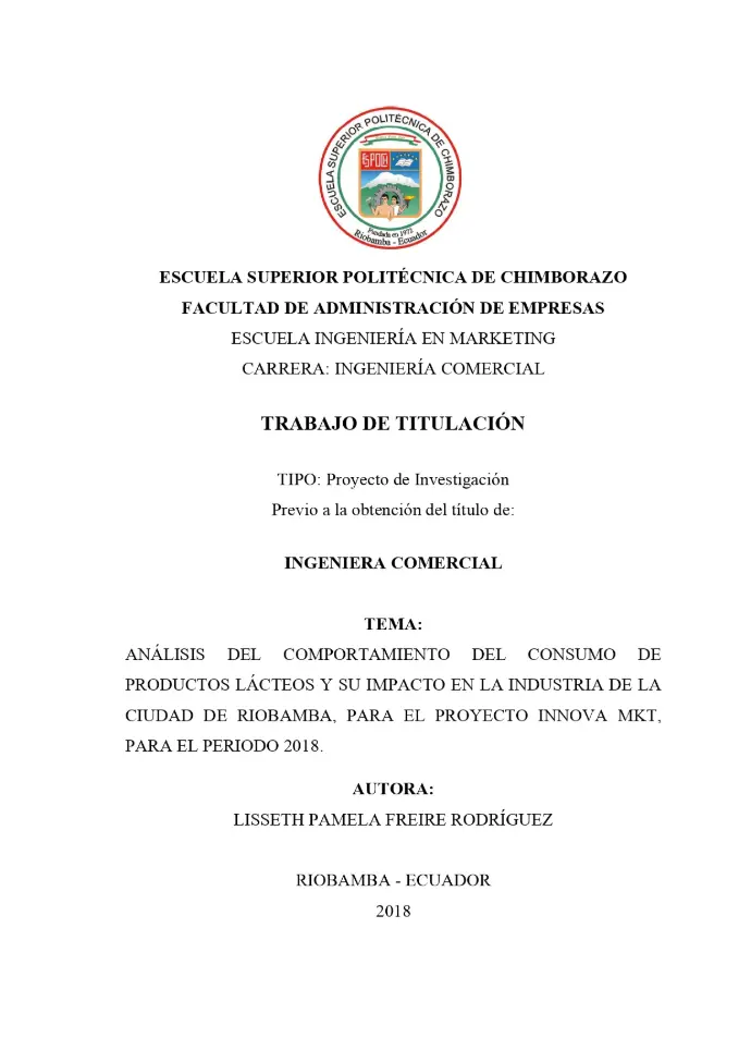 Análisis del comportamiento del consumo de productos lácteos y su impacto en la industria de la ciudad de Riobamba, para el proyecto Innova MKT, para el periodo 2018